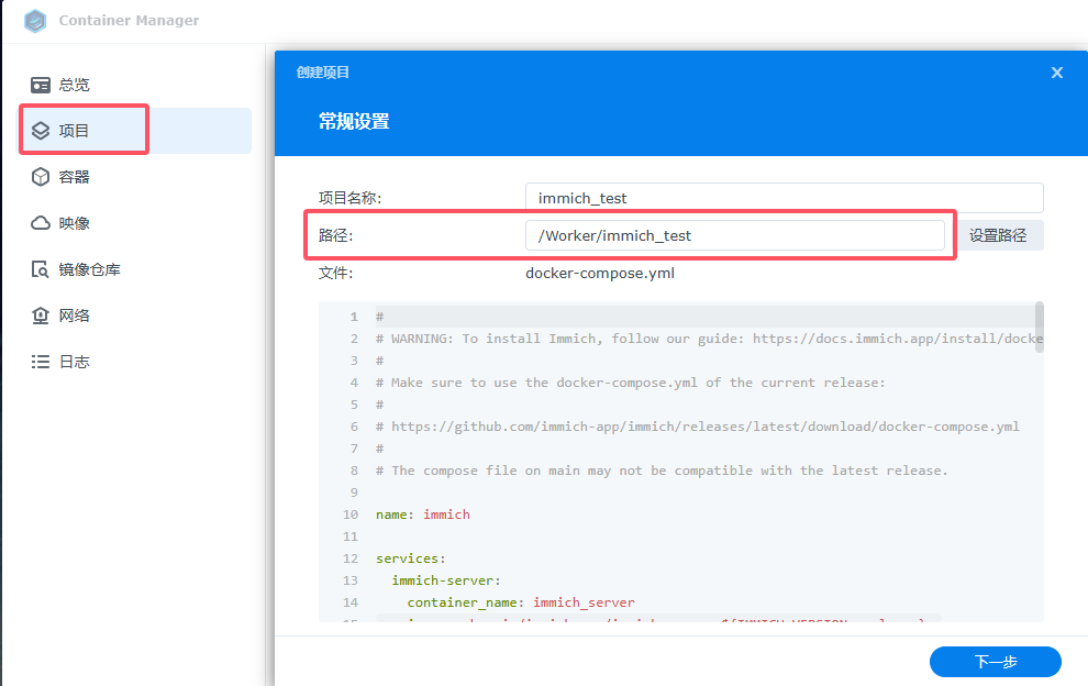 在docker中点击“项目-新增”,输入名称,选择为immich准备好的文件夹,提示存在“docker-compose.yml”,选择使用。