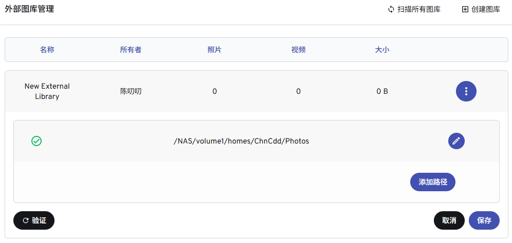 添加外部库,因为上面已经进行了NAS文件夹的挂载,这里可以使用“/NAS/***”的路径,例如“/NAS/volume1/homes/ChnCdd/Photos”挂载用户的DS Photo文件夹,然后点击“扫描所有”生成数据。