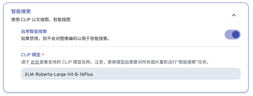 设置-机器学习-智能搜索,将CLIP模型改为“XLM-Roberta-Large-Vit-B-16Plus”,可以支持中文搜索。